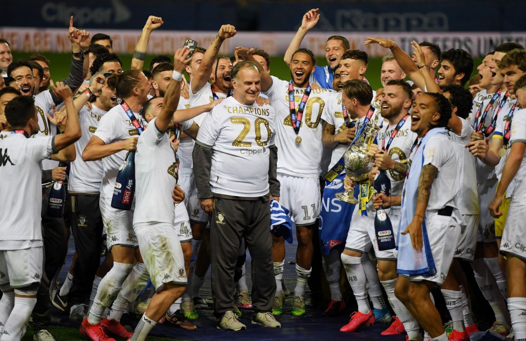 Leeds celebrating their title win in last season’s Championship with Marcelo Bielsa pictured centrally.